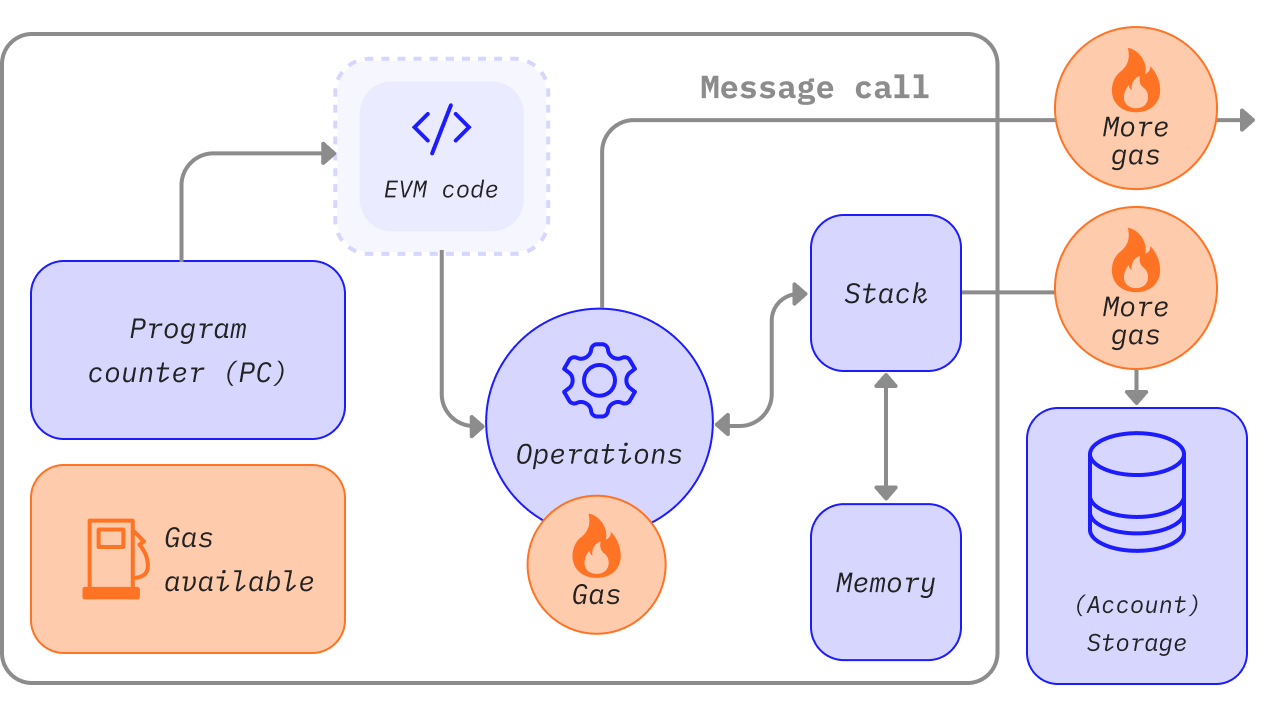 A diagram showing where gas is needed for EVM operations Diagrams adapted from Ethereum EVM illustratedopens in a new tab