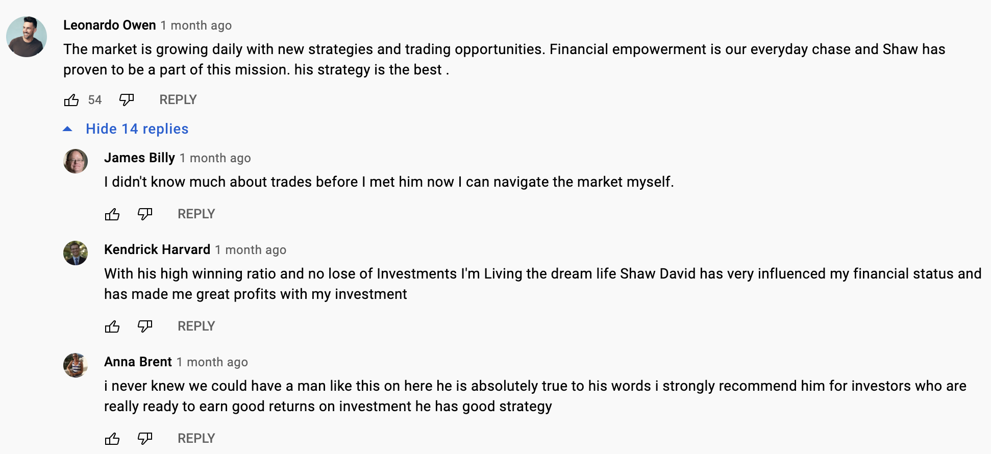 These fraudsters often find targets by using fake accounts on YouTube to start seemingly natural conversations about the 'broker'. These conversations are often highly upvoted to increase legitimacy, but the upvotes are all from bot accounts.